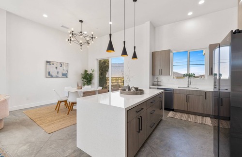 Welcome to The Sagebrush House! This highly updated retreat is located in the historic B-Bar Ranch of Desert Hot Springs. This relaxing and spacious modern home has panoramic views of the mountains and the Banning Pass. The backyard is fantastic for entertaining and provides a salt water pool and spa surrounded by artificial turf with large cement stepping pads, a cabana and is also surrounded by Ficus trees for privacy and guest relaxation.