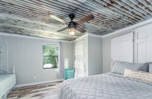 The “Shabby Shack” named for its adorable laid-back, shabby-chic décor, is a quaint 2BD/1BA lakeside cottage on Lake Seminole. With subtle elements of cabin warmth, from beadboard walls to the fun distressed tin roof ceiling, and chalkboard kitchen complete with retro Ampco double sink, this cozy shabby-chic cottage will make you feel right at home.
