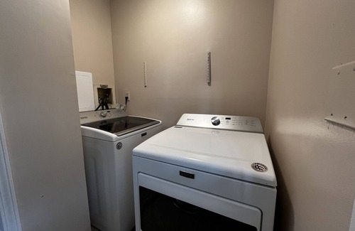 Two full bathrooms (one with a shower/tub combo, one with a stand-up shower) are stocked with towels, soap, shampoo, and a week's worth of toilet paper. A washer and dryer are available to make longer stays more convenient.
