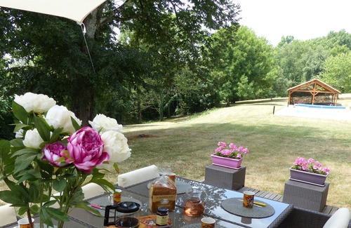 Private terrace of 25 m² with large garden furniture and shade sail, view and direct access to the pool.
