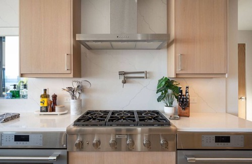 The open-concept main floor welcomes you with soaring windows that frame the ever-changing views of the Sound. The oversized living room opens completely to the outdoors through a four-panel sliding glass door wall, connecting the expansive deck to the heart of the home. Whether you’re curled up on the couch or dining al fresco, the panoramic views are front and center. The fully stocked gourmet kitchen features high-end appliances and plenty of prep space for shared meals, while the large dining table comfortably seats twelve. Also on the main level is one of the two serene primary suites with a king bed, private deck access, and an attached bathroom. A cozy bunk room—featuring one twin-over-full and one twin-over-twin bunk—sits just down the hall next to a full bath, perfect for kids or friends.