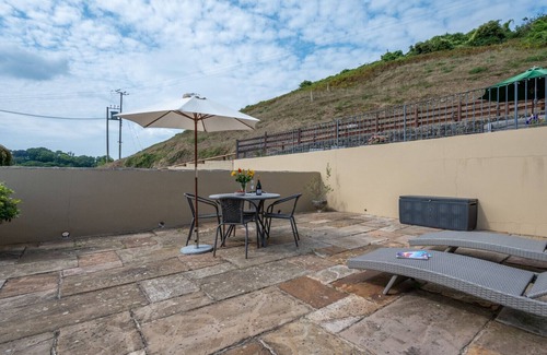 Outside : large patio area with outdoor furniture, 2 loungers and lovely views of the surrounding countryside