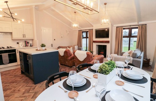 The living areas in the single-storey lodge include an open-plan living space with a kitchen equipped with an electric oven, gas hob, microwave, fridge/freezer and coffee maker, a dining area for four people, and a sitting area with a Smart TV, sofa bed and electric fire. The bedrooms consist of a double with a TV and en-suite shower room, and a twin with a TV, along with a bathroom. Outside, there is a wrap-around decking with furniture, shared lawn areas, off-road parking for one car, and roadside parking for two cars. Within 3 miles, you will find a shop, and within 0.8, a pub. Two well-behaved dogs are welcome, but please note that smoking is not permitted. WiFi, fuel, power, bed linen and towels are all included in the price. Enjoy contemporary comforts in gorgeous, rural Northumberland surroundings at The Tree Line 45. Note: Guests have access to: a golf course, tennis courts, regular visits from food outlets, a play area and membership to the swimming pool in Alnwick.