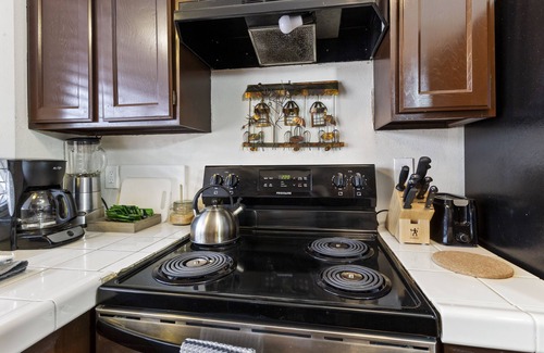 The dining area connects directly to the private courtyard offering an outdoor dining and grilling option. The spacious kitchen is well-equipped and has everything you need with all the cooking basics. Just bring your food, and you'll be set!