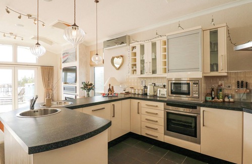 M45 Lodge, a single-storey cottage, consists of a kitchen with combi oven/microwave, induction hob, fridge/freezer, wine chiller, washer/dryer, dishwasher, and coffee maker, a dining area with dining table, and a sitting area with Smart TV with Netflix, sound system, and electric fire. The bedrooms consist of a super-king-size with TV, super-king-size with TV and en-suite walk-in shower, and a twin, along with a shower room. WiFi, fuel, power, bed linen, and towels are included in the rent. Outside, there is an enclosed rear decking with furniture and sea views, plus private, off-road parking for five cars. Two well-behaved pets are welcome. Sorry, no smoking. Shop and pub 1.4 miles, beach 0.1 miles. Enjoy your trip to the property M45 Lodge. Note: On-site facilities at The Warren Holiday Park are accessed via a leisure pass which needs to be requested directly (Charges apply for leisure facilities). Note: There is a good housekeeping bond of £350. Note: There will be tea towels but not other towels.