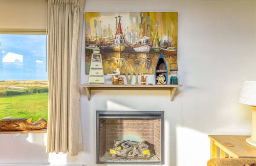 The charming living area features a cozy couch, coffee table, and two overstuffed leather recliners, all centered around a TV with DVD player and an electric fireplace. From here you can take in a cinematic view of the Pacific Ocean, the dunes, and the seabirds that flit above them. In good weather, you can adjourn to the private deck to smell the fragrant sea air. Dogs are welcome with our standard per dog, per night fee.