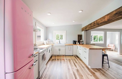 • Full kitchen, dishwasher, drip coffee pot, Keurig, Pink Smeg fridge