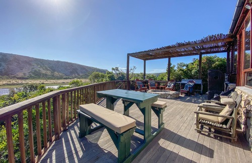 Rented on an exclusive basis (there are no other guests on the property during your stay). Set on a ridge of afromontane forest overlooking a spectacular river, 6 Km from San Sebastian Bay. A fully stocked water sports store and guests enjoy private access to the Duiwenhoks river. Two plunge pools filled with pure spring water, multiple entertainment decks and barbeque facilities. Max. capacity is 6 adults and 3 children. Three separate sleeping cabins (low walled stone cottages) interlinked by well maintained walkways - togetherness and privacy is the aim.