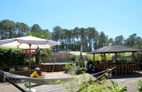 Single-family house "Ti Kaz Doudou", surrounded by trees. In the district of Ferron 1.5 km from the centre of Le Porge, 32 km from the centre of Cap Ferret, 50 km from the centre of Bordeaux, 9 km from the sea. Private: property 800 m2 (fenced) with trees, swimming pool (above ground) (4 m diameter, depth 130 cm, seasonal availability: 15.Jun. - 30.Sep.). Pergola, pool maintenance by the owner/gardener. Parking (for 2 cars) at the house. Shop 1.5 km, bus stop "Le ferron" 20 m, sandy beach "Le Porge Océan" 9 km.