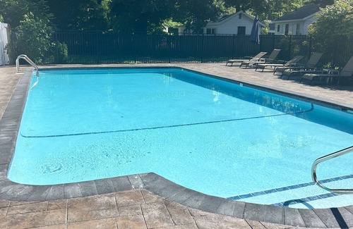There is a communal firepit, new fully fenced inground pool, concrete patio, and green space for registered Tiffany's Cottages guests use.