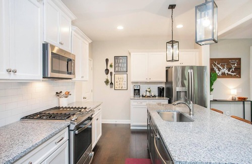 The home sleeps 10 comfortably, with three bedrooms and a bunk room that is perfect for the kids, equipped with a pac-man gaming console. Master bedroom with Queen bed on the main level. One King bedroom and a Queen bedroom connected to a full bath Jack and Jill upstairs. The bunk room is off of the upstairs hallway, closed off by a custom barn door. Each room is equipped with a smart TV. Take a short stroll down to the Lake!