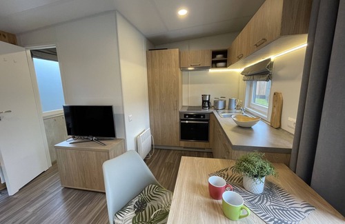 "Tiny Haus Waldsee Lodge", 2-room mobile home 24 m2. Object suitable for 2 adults + 2 children. Cosy furnishings: living/sleeping room with 1 double sofabed and satellite TV. Exit to the terrace. 1 room with 1 french bed (140 cm, length 200 cm). Open kitchen (2 induction hot plates, toaster, kettle, electric coffee machine). Shower/WC. Electric heating, air-conditioning. Terrace furniture, barbecue. ATTENTION: The Wi-Fi connection may be limited depending on capacity.