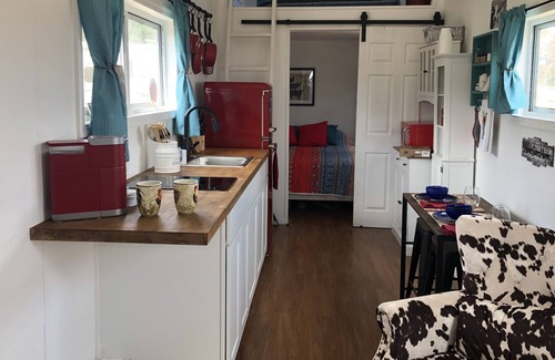 This tiny house has recently been completed and is available for this ranch stay! The tiny house has a downstairs bedroom with a queen bed and another queen bed up in the loft. It’s decorated with retro appliances and has everything you need in the kitchen. The bathroom has a full size shower with subway tile. The ranch has many animals to enjoy, including horses, miniature horses, mini cows, dwarf Nigerian goats, chickens and several friendly dogs! The livestock guard dogs and Basset Hounds will enjoy hanging out with you when you’re outside! We have a pool to enjoy in the summer months and usually it’s warm enough to swim in May thru September. There is a summer garden and you are welcome to stroll through and pick your organic veggies for dinner! The hens will also provide you with fresh eggs, when the ladies are laying. Come and enjoy the quiet of the country, yet be close to towns and activities.
