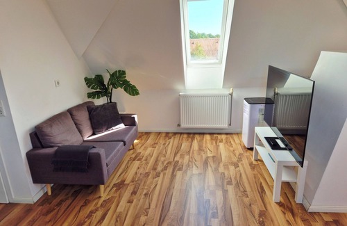 Enjoy your stay in the north of Munich in this beautiful top-floor flat for two people. The 45 m² flat has a bathroom, a small kitchenette, a dining table, a couch with a smart TV and a large double bed. From the accommodation, you can walk to the train station in 10 minutes and reach the city centre or the airport in 20 minutes by S-Bahn. There are also numerous restaurants and shops in the immediate vicinity. The attic flat is located on the third floor (no lift) of a house. It is a completely independent flat with its own entrance. There are five free parking spaces directly in front of the accommodation which can be used at any time without restriction. You can also park for free on the street in the neighbourhood. The key for the flat is in a key box at the entrance to the house. The check-in is contactless. Instructions will be displayed in your booking overview 48 hours before arrival.
