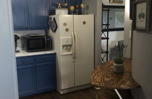 The dining room seats 6 for meals. We’ve a handy craftsman bartop in the kitchen with 2 cushioned swivel stools. There's a vintage 1960's TV tray stand with 4 trays that can be used as laptop tables or dining trays in the living room.