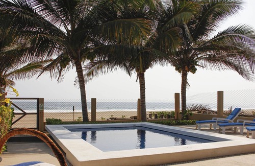 This is a beach-front bungalow. All kitchen and living areas are on the ground floor. There is a lounge area on the upper terrace. Only a 4-minute drive from Zihuatanejo International Airport.