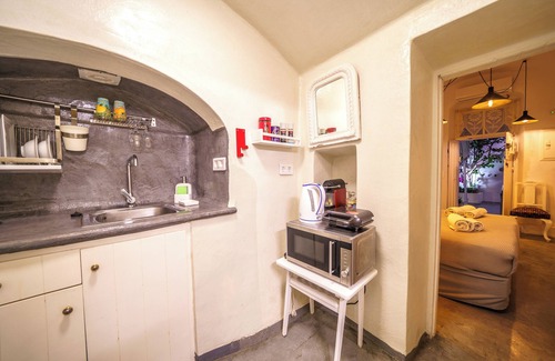 This charming traditional cave house is in the heart of old Oia . It sleeps 2 people. There is a Bedroom with a queen bed, a kitchenette, a bath with shower & an outdoor private hot tub. Wi Fi in all areas (indoors-outdoors).The 2 level rooftop garden, as well as the yard, are shared with the Apartment's and Studio' s guests. No direct view from the house however you are invited to enjoy Oia's famous sunset view, the amazing Caldera and Ammoudi port from our SANTORINI PARADISE shared rooftop terrace, about 2 minutes walking distance while tasting complimentary wine and snacks!