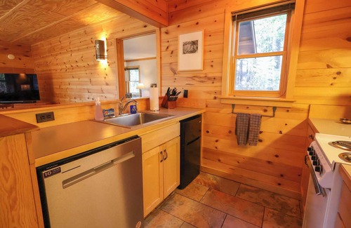 The galley kitchen is located off the entryway and has an electric stove with oven, under counter refrigerator, microwave, sink and coffee maker. There is a compact bathroom with a shower. A small deck is equipped with a propane BBQ grill and a pair of adirondack chairs with a picnic table nearby. This cozy cabin makes a great Mazama basecamp for up to six guests.