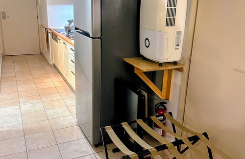 The fully furnished unit offers, safe box in closet. And plenty of space to stretch out and relax, especially in the comfortable king size bed and comfortable sofa. Fully equipped kitchen offers Espresso/Cappuccino machine, coffee maker, tea kettle, blender, 4 burners on brand new electric top stove, for cooking. No conventional oven, but the microwave is also an oven/grill in one and a toaster. NO working dishwasher at this time.
