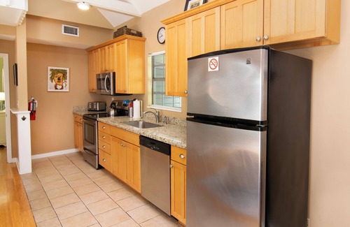 The sleek, fully equipped galley kitchen has granite counters, hardwood cabinets, tile floors, and stainless appliances, including a glass-top stove, oven, microwave, dishwasher, full-size fridge, and farmhouse sink. Prepare a tropical feast after a day at the beach! The open design ensures that a chef is never isolated from the group.