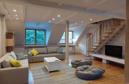 We invite you to rent a bright, duplex apartment in the green neighborhood of the Royal Łazienki in Warsaw. The apartment has a bedroom with three beds and a bathroom, a living room with a bedroom area with 2 beds and 2 sofa beds, a kitchen and an additional bathroom. Upstairs, there is a bedroom with a large bed and a bathroom with a shower. Near the apartment, there is public transport (buses, trams, metro - 15 minutes to the city center). Short-term rental.