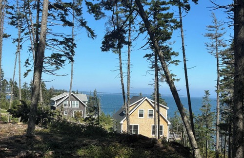 Enjoy two beautiful dog-friendly oceanfront cottages with panoramic sea views and expansive walking trails out the back door. You will fall asleep listening to the sound of the ocean, smell the sea and watch lobster-fishing boats hauling their traps. Out the back door you will find a myriad of wonderful wooded paths for walking. This is a family property where we have two cottages, both of which have beautiful views and everything you could want. The first cottage has 3 bedrooms (all second floor), a full bath and a half bath, the second cottage has 4 bedrooms, with a master bedroom and full bath on the first floor, and another full bathroom and three bedrooms on the second floor. Master bedroom of new cottage has French doors opening onto the deck.