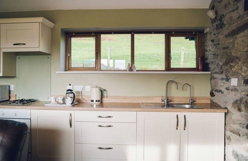 The barn features an open plan kitchen and living space, a private bathroom, bedroom, off-road parking and a patio with stunning views of the mountains.