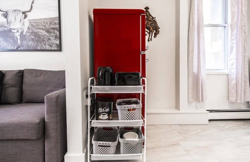 This stylishly renovated historic suite, built in 1915, offers a blend of vintage charm and modern luxury near the Calgary Stampede grounds. Amenities include 1G high-speed internet, streaming services, a fully equipped kitchen, queen bed, workspace, washer/dryer, and keyless entry. The decor features a urban cowboy atmosphere. Located in the historic Ramsay neighborhood, it's close to local attractions and the Bow River pathway, making it an ideal base for exploring Calgary.