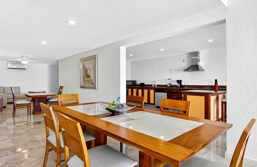 The inviting living area is designed for relaxation and connection, offering plush sofas and armchairs that open onto a private terrace with stunning views of Banderas Bay. Prepare meals in the fully equipped kitchen, complete with a breakfast bar and pantry, or gather for dinner around the eight-seat dining table for memorable shared experiences.