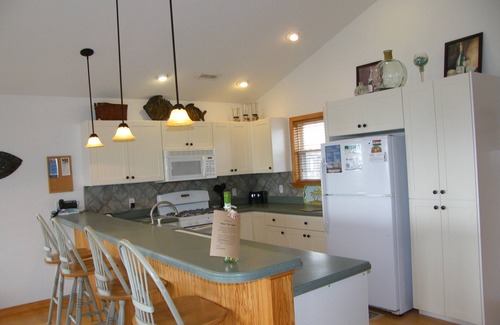 The upstairs living area has a half bath with washer/dryer for convenience. The expansive open Great Room has laminate hardwood floors and spectacular ocean views from nearly every window. New furnishings with large flat screen, DVD, stereo and plenty of books provide relaxing entertainment after a long day at beach. The dinner table located near slider provides dining with ocean view. The large kitchen has a long breakfast bar with Corian countertops and is overstocked with utensils for the best cooks. The furnished upper level deck with sunbathing chairs and cover table area provides hours of beautiful ocean views and star filled moonlit night skies.