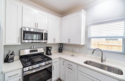 Welcome to our gorgeous, family-friendly home! Ideal for friends and family, enjoy modern decor in this elegant retreat. Our three-bedroom home boasts a variety of sleeping arrangements, including 1 king, 1 queen, 1 bunk bed with a double on the upper and lower bed. Prime location between downtown, Pensacola Beach, and NAS Pensacola. Immaculate interior with brand-new fixtures, stainless steel kitchen, central air, free Wi-Fi, smart TVs, and private grill ensure comfort and convenience. The primary bedroom boasts regal comfort with a spacious king-size bed and a luxurious ensuite bathroom for your relaxation and convenience. In the second bedroom, a cozy queen-size bed awaits, providing a tranquil retreat. The third bedroom is perfect for kids or friends, featuring a double bunk bed with full-size mattresses on both the upper and lower levels. A shared hall bathroom ensures convenience for all guests. Downstairs, a convenient powder room is available, and additional sleeping space is provided in the living room with a comfortable sleeper sofa. Enjoy comfort and convenience throughout this inviting home.