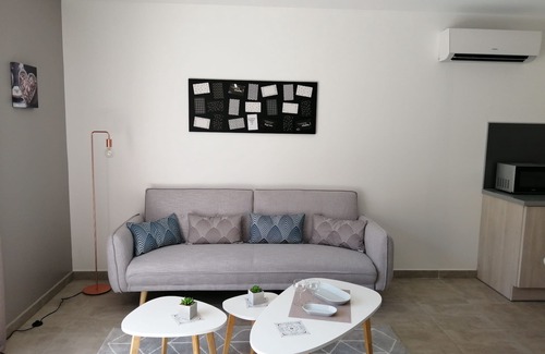 For rent attractive 79m² air-conditioned single storey villa with wooden swimming pool 5.5mx 1.27m deep and 200m² of land. well exposed, the Villa is composed of a living room with TV TNT Hertzien (screen LED 1. 17m), Fully equipped kitchen, induction lights, multifunction robot, Senseo pod.