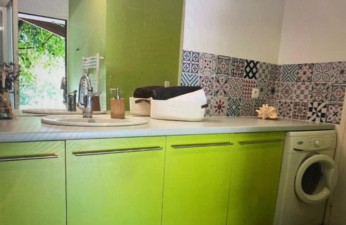 The vacation home "Gite D'ici Et D'Ailleurs" in Saint-Morillon is a great choice for a stress-free getaway with your loved ones. This 80 m² property consists of a living room with a sofa bed for 2 people, a fully-equipped kitchen, 2 bedrooms, 1 bathroom, and an additional toilet, and can accommodate 6 people. On-site amenities include high-speed Wi-Fi (suitable for video calls), a TV, a fan, a dishwasher, a washing machine, and a selection of children's books and toys. A baby cot is also available.