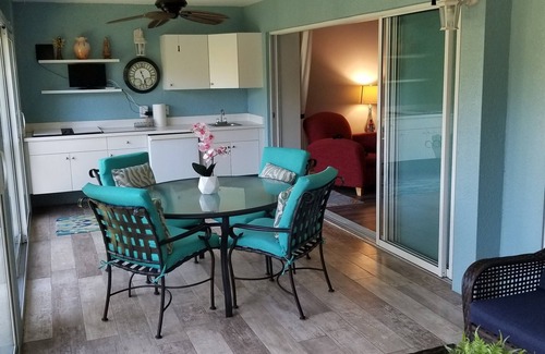 The outdoor kitchen in the oversized lanai includes a complete outdoor kitchen with Electric BBQ cooktop, outdoor fridge and sink for your meal preparation convenience. You can enjoy all your meals on the outdoor dining table or spend time reading a book on the conversation area while enjoying the breeze provided by the ceiling fans. Pocket patio doors brings the lush tropical outdoor setting right inside your condo.