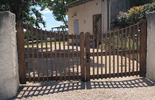 house and garden overlooking a private field belonging to us, with a breathtaking 180 degree view of the Gers hillsides and view of Lectoure and the Pyrenees (if the weather is clear)