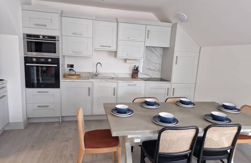 Ground floor flat has an large open plan kitchen, dining and living, 2 double bedrooms with en-suites and a patio garden sleeping 6 people perfect for gathering around