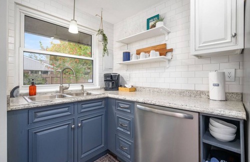 Guests may park on the street, in the driveway, or in the attached single-car garage. After entering through the front door into the entry space, you'll find an open living room with a comfy sectional sofa and 50” TV. Around the corner is a dining area for four, and a welcoming and modern kitchen with granite countertops and stainless-steel appliances perfect for enjoying homemade meals. Off the dining area is the entrance to the attached single-car garage and sliding glass doors that lead to the patio and fenced backyard. A stacked washer and dryer is conveniently set in a laundry closet in the kitchen, with bifold doors for sound control. The large windows in the front and sliding glass doors in the back offer plenty of natural light, and the rich browns and bold blues in the decor bring comfort with a touch of drama.