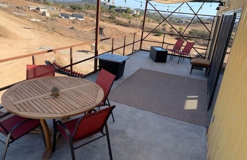 Get away from it all when you stay at this relaxing and peaceful place in the heart of Valle de Guadalupe. This beautiful eco-friendly 1-bedroom space is located on the second floor surrounded by nature and beautiful views of Valle de Guadalupe. This unique shipping container transformation includes a queen-sized bed, a cozy seating area and kitchen with a full-size refrigerator. Picture yourself enjoying the sunrise/sunset with a cup of coffee or a glass of wine on the private terrace. TOP UNIT