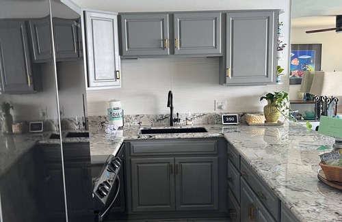 Kitchen has been remodeled with new granite countertops. All new Samsung appliances throughout. Including the Samsung wash/dryer tower that can steam your wrinkled clothes from traveling.