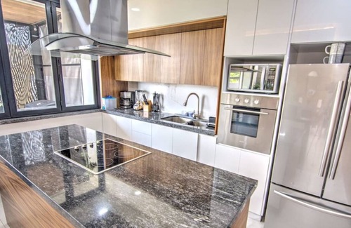 This luxurious 3-bedroom villa is the perfect family retreat. With spacious interiors and elegant decor, this vacation rental is designed to provide the utmost comfort and relaxation for your family. Air conditioning and high-speed wifi throughout all the bedrooms and living spaces. One of the three bedrooms is conveniently located on the ground floor, while the remaining two are up the stairs. The main bedroom has a private patio, which is perfect to enjoy your morning coffee. The kitchen is fully equipped to prepare delicious home-cooked meals for the entire family (ask for our private chef options). 2 private parking spots are available. With top-notch amenities and 24/7 gated security, this family-friendly retreat is the perfect place to relax and unwind.