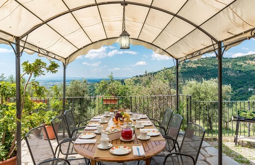 With its hilltop position, Villa Fabi enjoys a breathtaking panorama over Cortona and the Val di Chiana. The villa is immersed in an olive grove of 8.000 sq m, completely enclosed, at the edge of an old oak wood belonging to the same owners. The guests can go into the woods through a small gate for pleasant walks. All the land around the villa is terraced with stone walls and has shade from the many old olive trees that characterize the property. Outside the kitchen French window, on the more panoramic side of the house, the owners have placed a gazebo equipped with table and chairs so that guests can organize alfresco meals in all tranquillity.Please notice that photos are taken in spring, therefore flower blossoming, and the colours of the gardens' grass could be different at the moment of your arrival at the villa.