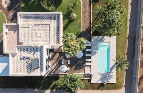 Nestled in a typical Salento countryside setting, surrounded by a beautiful 6,000-square-meter garden, stands an exclusive, detached villa on three levels.