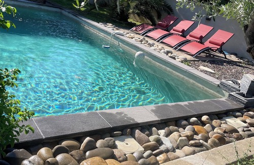 contemporary villa on land of 1400 m 2, comprising 4 bedrooms, a large living room, dining room, an equipped kitchen, a bathroom, terraces, private pool, quiet; Automatic watering. House can accommodate 3 additional people on request with supplement. (2 extra beds 1 person and a baby or child cot).