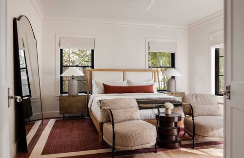 Designed as a functional sensory collage, every space and surface in the property invites ease while creating texture, and interest. Dimmable designer lighting throughout the interior and exterior add a dimension of mood and tone to the space. Layered behind the 4 bright and crisp main house bedrooms, guests will find 3 lush and moody casita bedrooms nestled among the mallorca inspired flora. Intimate interior and exterior lounge and living areas are peppered throughout the property are designed to cultivate closeness and connection.