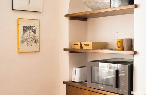 The apartment was recently renovated with care to preserve its original charm: wall paintings and decorative friezes from the 1950s and '60s, antique furniture, and a vintage sewing machine in the living area all contribute to an authentic, nostalgic ambiance.