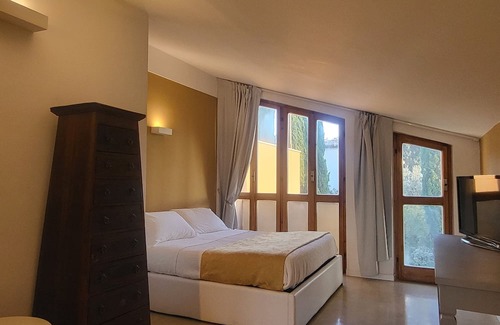 On the top floor of the villa is the Junior Suite, which, together with the Senior Suite, is one of the most exclusive rooms in the villa, equipped with air conditioning and radiators. At the entrance there is a cabinet and a wardrobe, while to the right is the bedroom, with a French bed and two wall-mounted bedside lamps, along with electrical sockets for charging the telephone. In front of the bed, there is a window and a French window with blackout curtains, connecting the room to a large terrace with a view of the pool, together with a small table and two chairs. The Suite's private bathroom is windowed and has a toilet, bidet, washbasin with a large mirror, and a walk-in shower with overhead shower and hand shower, as well as hydromassage jets.
