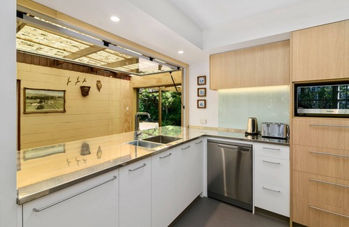 The front porch and lawn is the perfect place to relax during the day, gaze out at the water, read books and sunbathe. The private courtyard out the back has a bbq and outdoor seating area, and is great for drinks and dining in the evening.