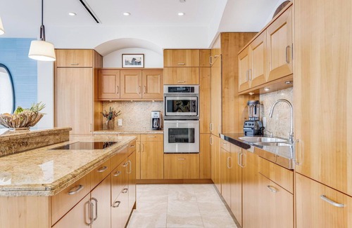 The open floorplan gracefully extends to the outdoor lanai through sliding doors, securing an added layer of ambiance and flow to your stay. Catch the game or a movie from the 60†HDTV in your spacious living room. Pick up local fruits and vegetables and let them inspire your own prepared meals from the gourmet kitchen, complete with top-of-the-line stainless steel appliances including a Gaggenueau cooktop, SubZero refrigerator, and a specialty coffee maker. Choose to dine casually at the kitchen island or more formally at the dining table.