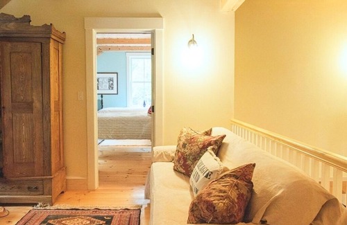 On the first floor, the 100 year old dining table seats six. The "Away" room contains seating and a large armoire holding a Smart TV and games We have internet for your convenience. First floor bath has a large old fashioned sink and a good size shower, cabinet for towels. Nestled close by is the washer and dryer in it's own nook.
