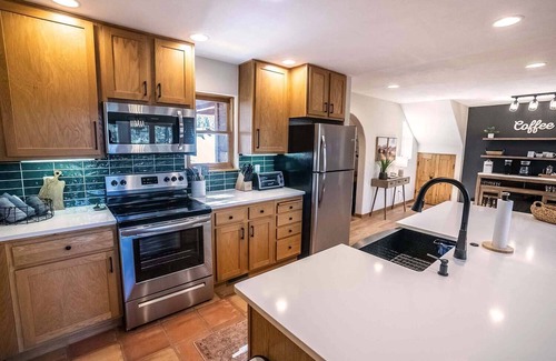 Welcome to Rustic Chalet! This fully renovated (completed in 2022) cabin is the perfect luxury mountain getaway for you and your family. While much of the furniture and decor is new and boasts a more mid-century modern feel, it was important to the owners to maintain the integrity of the original build by keeping the original Saltillo tile in certain areas, hand-crafted baseboards, thick, rich wood beams, and arches throughout. Step inside to see the amazing view of Wheeler Peak through the large floor-to-ceiling windows. The kitchen has all new appliances, backsplash, and quartz countertops, and is fully stocked with everything needed for cooking a homemade meal. Adjacent to the kitchen, you'll find a coffee/wine bar, complete with a drip coffee maker, Keurig, French press, and electric water kettle, plus a wine fridge to keep your beverages cool. Just down the hall from the kitchen and laundry room are two-cozy but spacious bedrooms, each with a comfortable and luxe queen-sized bed, closet system, and smart TV. The full-hall bathroom is just a few feet away from each of the queen bedrooms. It has all-new gorgeous tile on the walls, a new tub, a new sink, updated lighting, and plenty of natural light. The Living Room boasts a gas fireplace and a large-screen TV to stream your favorite shows with complimentary Hulu Plus and Disney Plus. The Primary Suite has a plush California King-sized bed, a smart TV, and double doors leading out to the large deck. The en-suite bathroom has a double walk-in shower and soaker tub, plus plenty of closet space and natural light. Upstairs is an open loft with 2 cozy full-sized beds, a smart TV, games, and a shuffleboard table for a little après-mountain activity fun. The most gorgeous view of Wheeler Peak can be seen from up in the loft area. Take a look out the windows to see skiers making their way down the slopes. With only a 7-minute walk to the base of Angel Fire Resort plus several restaurants and shops, the location is completely ideal! Enjoy s'mores by the fire pit, grilling food on the propane grill, or take a quick stroll to restaurants and shopping. The Angel Fire Country Club boasts a gorgeous golf course, indoor pool, restaurants, and bar and is only a 6-minute drive away from the cabin.